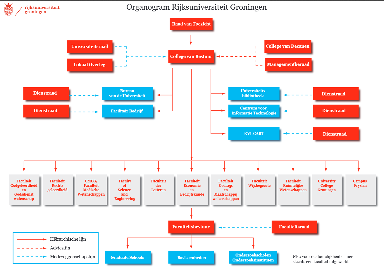 In the figure below the structure of the University of Groningen (RuG) is depicted. The RuG is devided into faculties; the studies of the FMF are part of the Faculty of Science and Engineering (FSE). The University is governed by the Board of the University. A student also has a seat on the Board. The student-assessor is appointed by the Board of the University on the recommendation of the student members of the University Council. The board is responsible for o.a. the university strategy, accommodation issues and financial, personnel and material resource management.